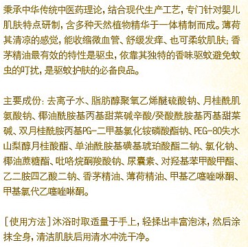 潤本草本防蚊沐浴露秉承中華傳統(tǒng)中醫(yī)藥理論,結(jié)合現(xiàn)代生產(chǎn)工藝,專門針對嬰兒肌膚特點研制,含多種天然植物精華于一體,精制而成。薄荷其清涼的感覺,能收縮微血管、舒緩發(fā)癢、也可柔軟肌膚;香茅精油有效特性是驅(qū)蟲,依靠其獨特的香味驅(qū)蚊,避免蚊蟲的叮咬,是驅(qū)蚊護膚的必備良品。